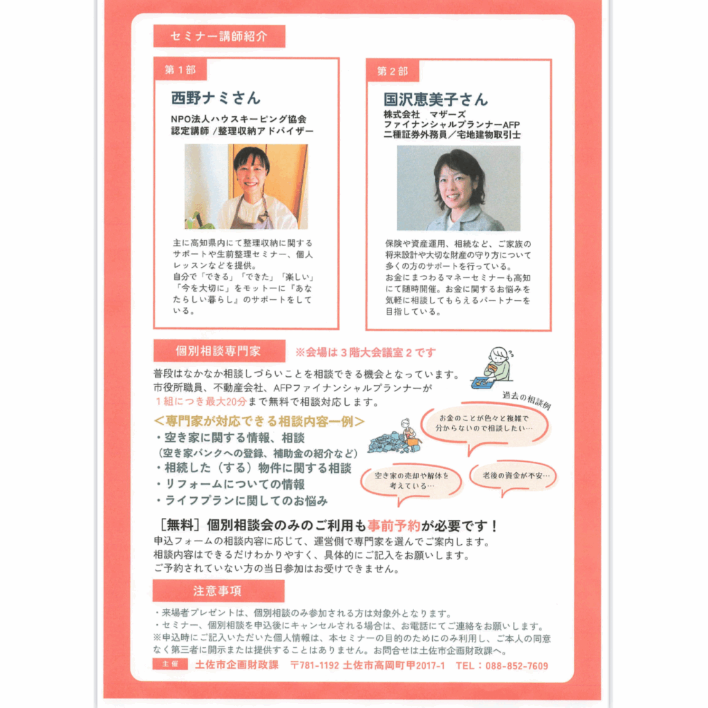 空き家に関する制度(補助金の種類や利用の条件)、リフォームについて、その他、ライフプランについてなど、普段はなかなか聞けないことを専門家に無料で相談できます。