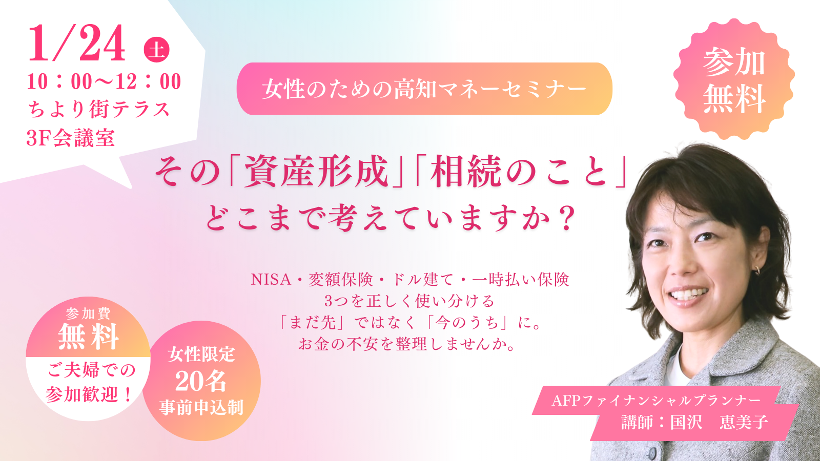 | 定員 | 女性限定 20名(事前申込制)、ご夫婦参加歓迎 |